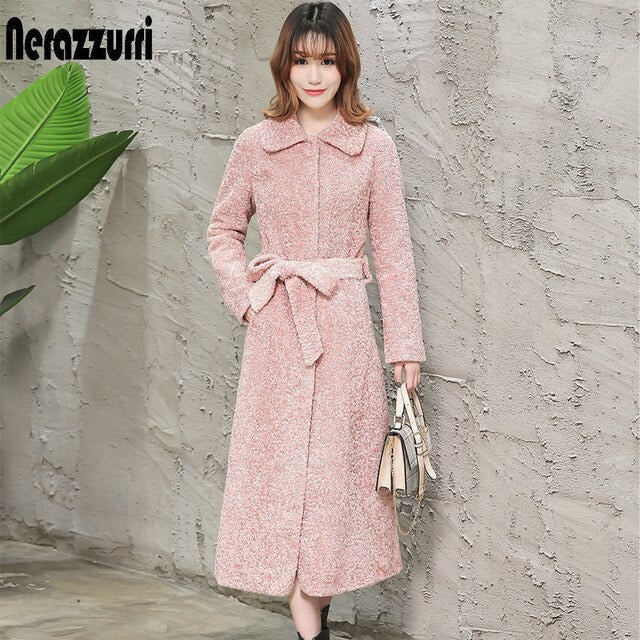 Nerazzurri Winter long faux fur coat women long sleeve turn-down collar plus size fake karakul fur coat with belt 5xl 6xl 7xl